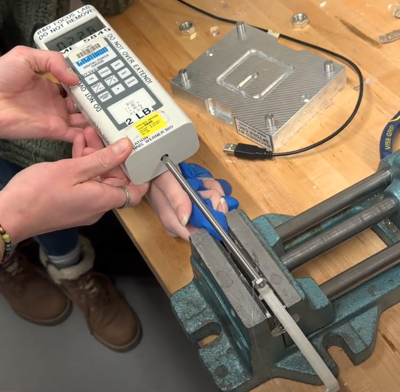 This test aimed to quantify the force required to operate the device and ensure that it was under the required limit of 22 N. To accomplish this, the device was attached to a syringe and held in place with a vice. The needle of the syringe was inserted into a container of water. A force gauge was then used to push on the grip and draw water. The force reported by the force gauge was recorded three times throughout each trial and was averaged.
